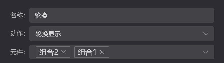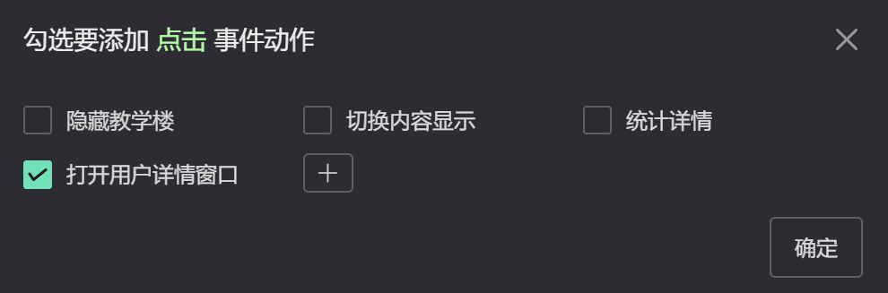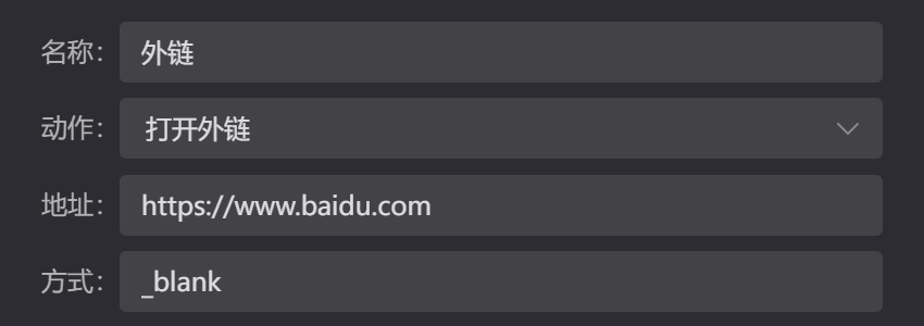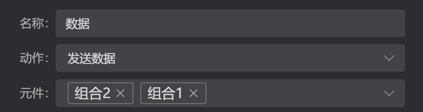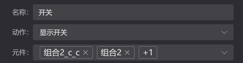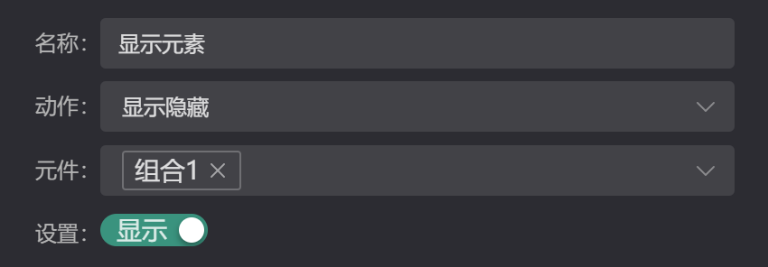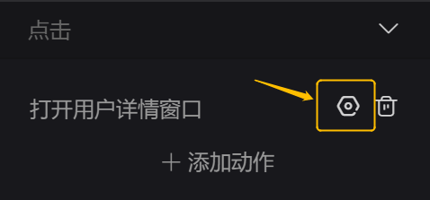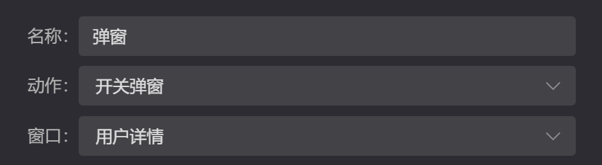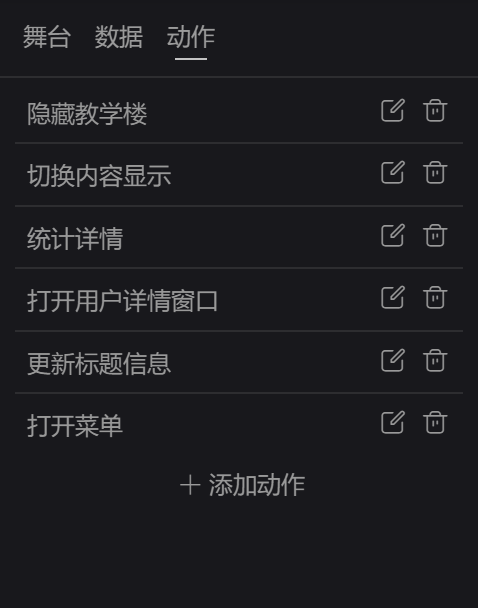- 动作:当前系统内置(显示元素、开关元素、数据传递、模块切换、开关弹窗、新开窗口)与用户自定义动作