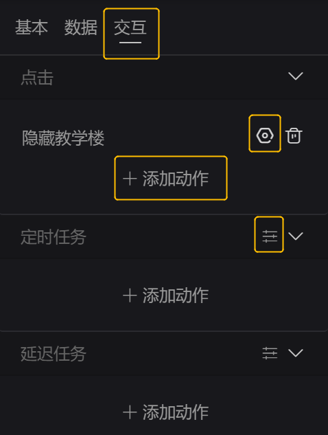 任何元素都具备(点击、定时、延迟)三个事件,添加方式如下: