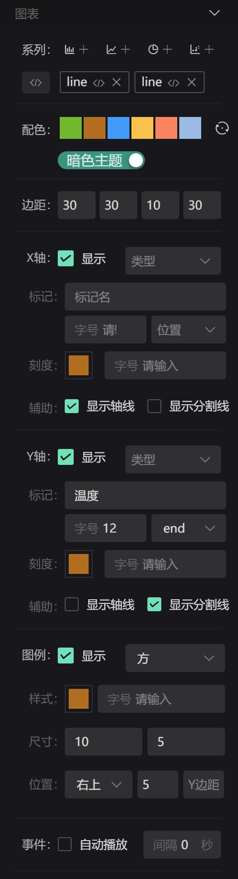 - x轴:包含类型、标记、字号、位置、刻度色、刻度字号、是否有辅助线、是否有分割线