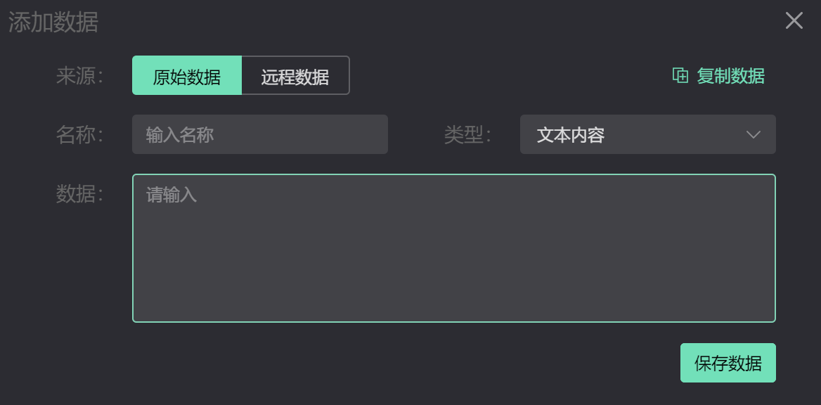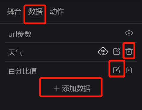 两种来源,添加与维护在编辑器右侧的数据面板上操作。